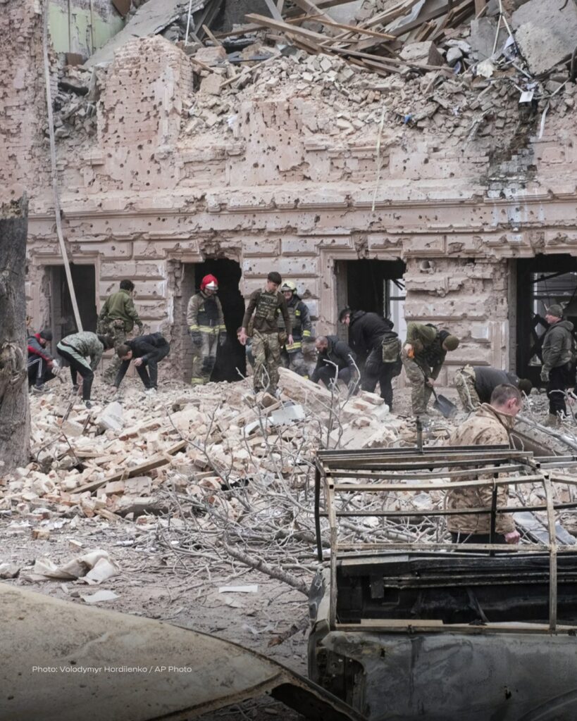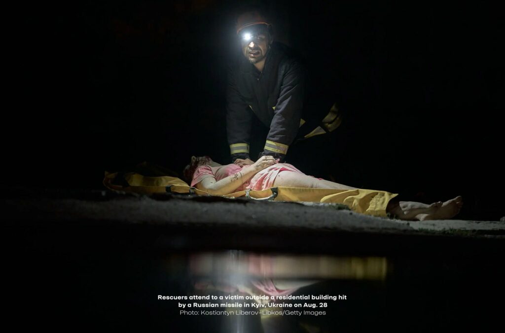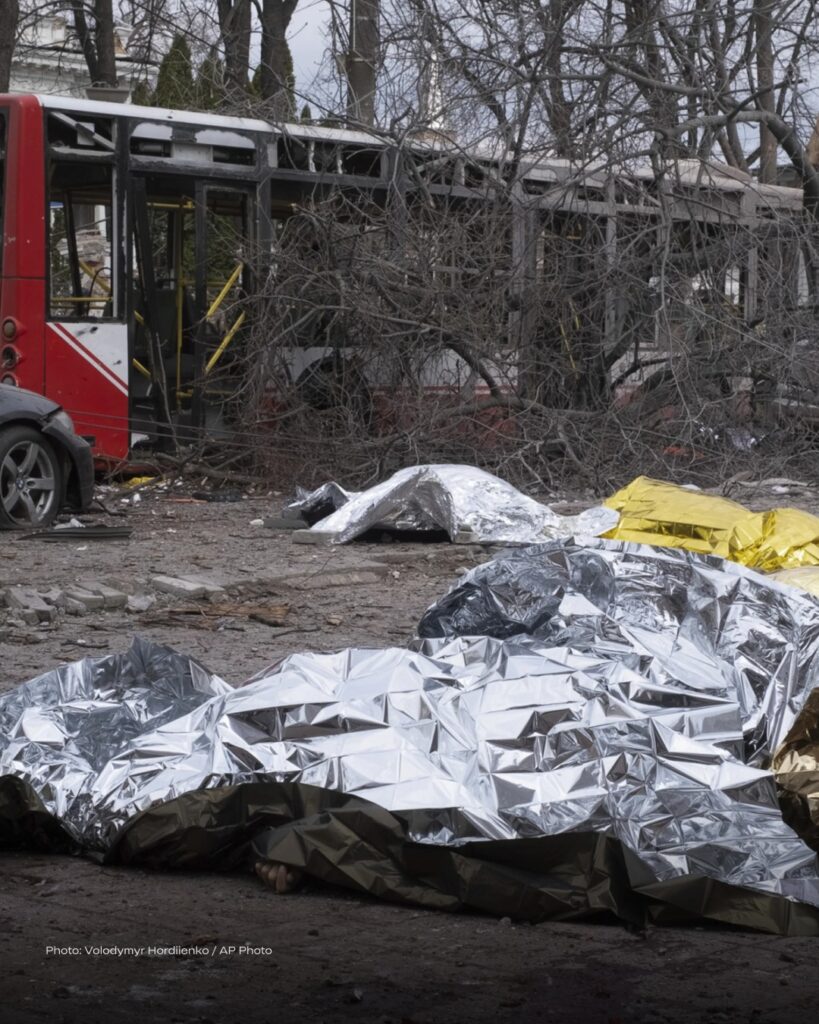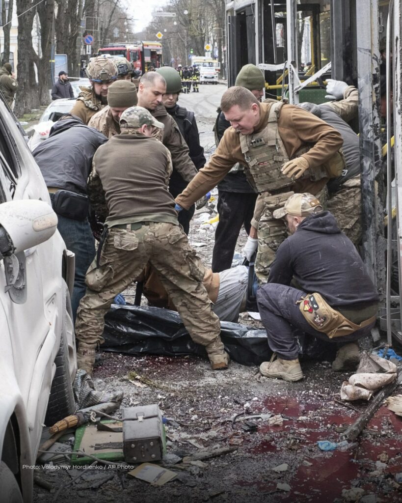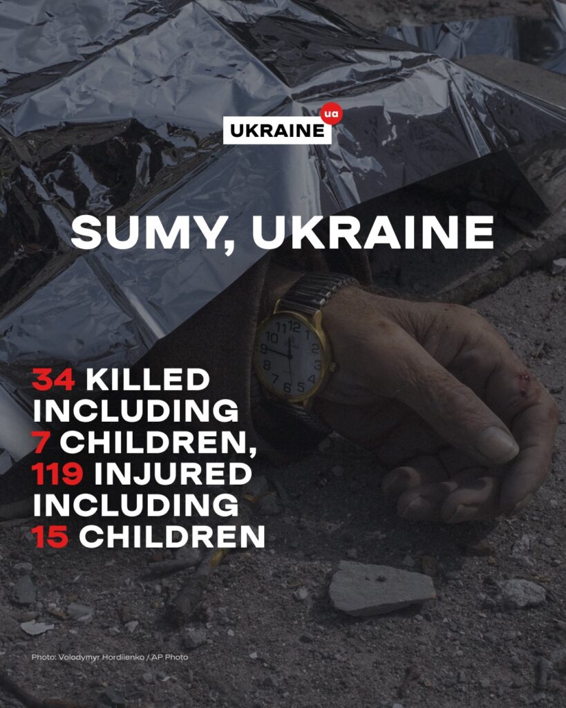 Les deux photos ci-dessous ont été prises le 24 avril et le 28 août 2025 à Kyiv, après la chute de missiles russes. Les photos du diaporama montrent les conséquences du bombardement de Soumy, le 13 avril 2025, par deux missiles balistiques Iskander-M. C’était le dimanche des Rameaux. Un trolleybus a été détruit et la plupart de ses passagers tués.
