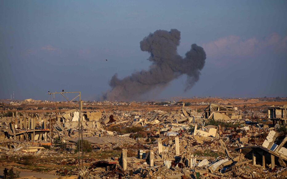 Cette photo prise depuis le camp de Nuseirat, qui accueille des Palestiniens déplacés, montre des bâtiments détruits et une épaisse fumée s’élevant au loin après des frappes israéliennes à l’est de la ville de Gaza, le 2 décembre 2025. Le cessez-le-feu entré en vigueur le 10 octobre reste fragile, Israël et le Hamas s’accusant mutuellement de violations, tandis que la bande de Gaza demeure en proie à une grave crise humanitaire. Photo : Eyad Baba / AFP.