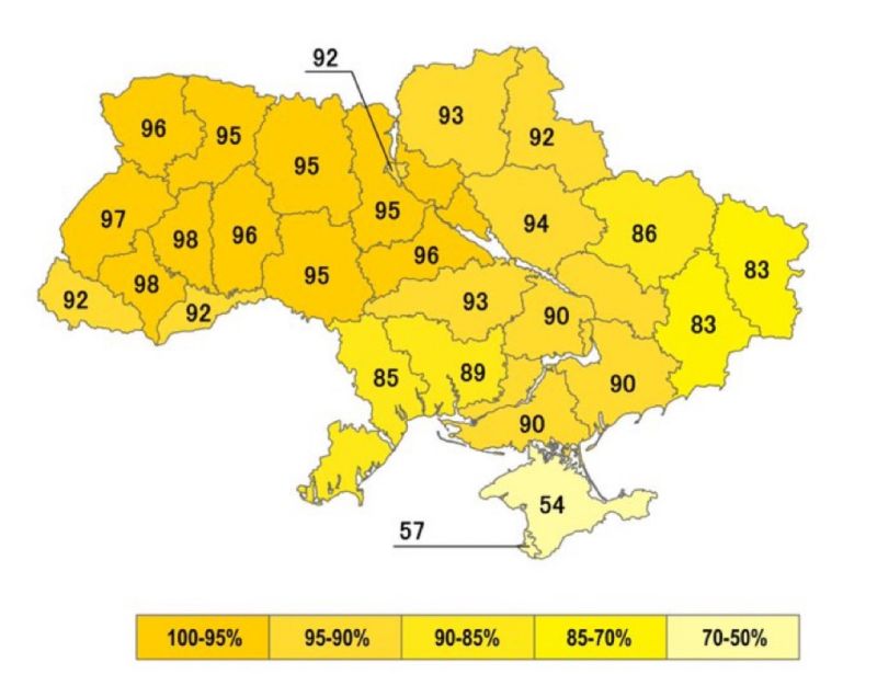 Résultats du référendum sur l’indépendance de l’Ukraine organisé le 1er décembre 1991. On remarque que les russophones du Donbass, à l’est, ont majoritairement voté oui. Certains voulaient rester dans le giron de Moscou mais ils étaient très minoritaires. En revanche, en Crimée, il y avait une assez forte minorité de non.
